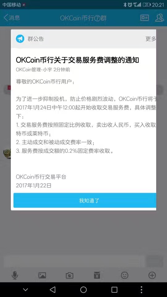 火币网、币行(Okcoin)及比特币中国各自在官网发布公告称,为了进一步抑制投机,防止价格剧烈波动,将于2017年1月24日12点起,对比特币和莱特币的交易开始收取交易服务费。具体调整如下:交易服务费按固定比例双向收取,卖出收取人民币,买入收取比特币或莱特币;主动成交和被动成交费率一致;服务费按成交金额的0.2%固定费率收取。