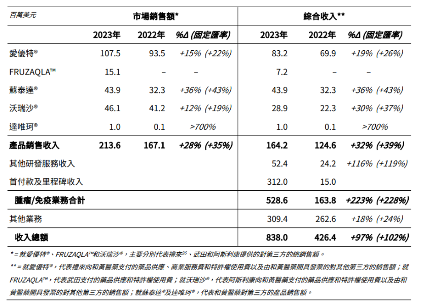 因而,和黄医药2023年的业绩也得益于前述两个事件。报告期内,公司肿瘤和免疫业务综合收入增长223%至5.286亿美元。
