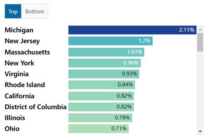 而密歇根州既是美国大选的关键摇摆州,又是美国阿拉伯裔人口最多的州。目前密歇根有21万阿拉伯裔,占该州总人口的2.1%。除密歇根之外,阿拉伯裔人口占比最高的分别为新泽西州、马萨诸塞州、纽约州和弗吉尼亚。