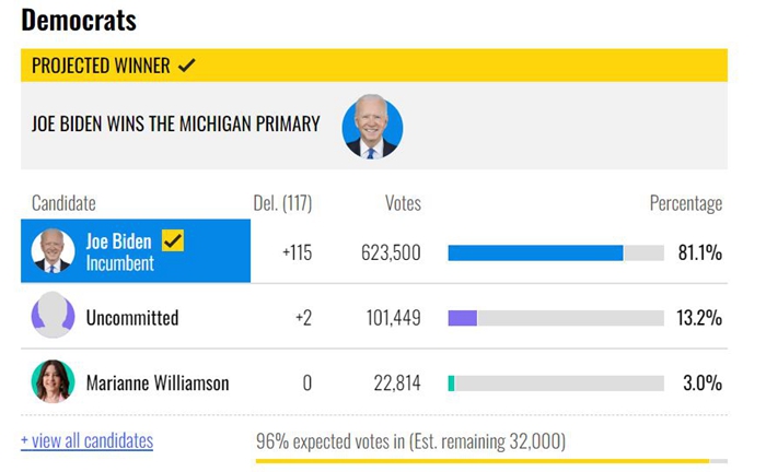 在密歇根初选中,民主党有117张党代表票。拜登获得了115张,剩下的两张则由“不表态”收入囊中。