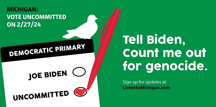 “倾听密歇根”的宣传标语用尖锐的词语表达了选民的不满:告诉拜登,不要把我算到种族灭绝中。