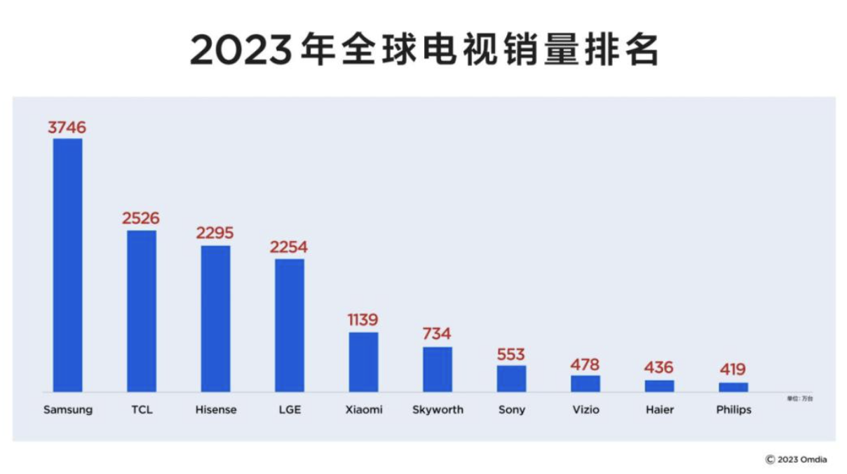 根据机构Omdia统计的2023全球电视销量榜单,三星以3746万台的销量夺得冠军宝座,TCL则以2526万台的成绩排名次席,海信、LG和小米紧随其后。