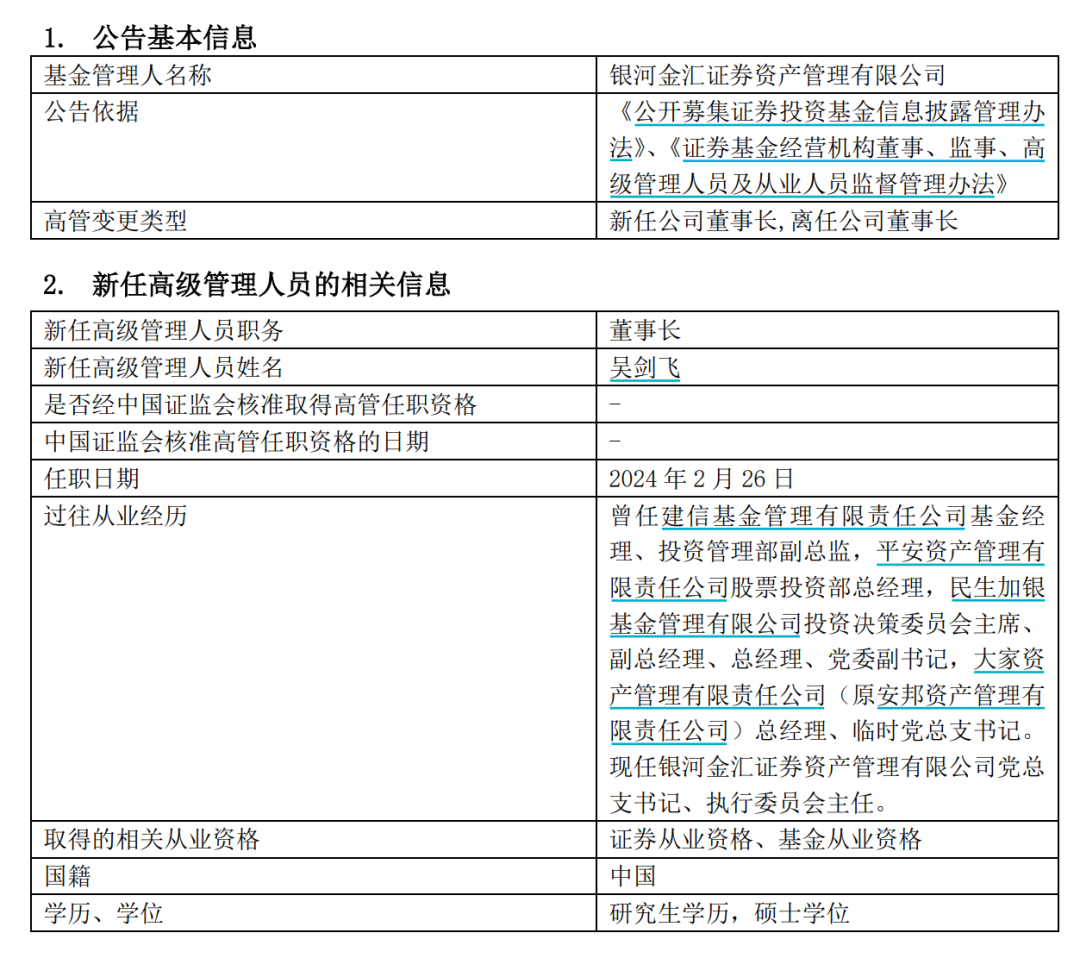 2月28日,银河金汇发布高管变动公告称,吴剑飞获委任为公司新任董事长,任职自2024年2月26日起。公司前任董事长刘冰因工作变动于同日离任。