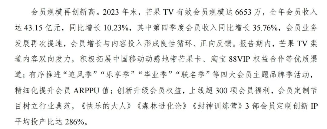 譬如说,此次爱奇艺公布其平台订阅会员数已触达1.011亿,2023年爱奇艺会员服务营收达到203亿元,同比增长了15%;芒果超媒方面,会员收入从2022年的个位数增长,跃升到了2023年的同增双位数,全年有效会员“6653万”这个数字也是再创新高。