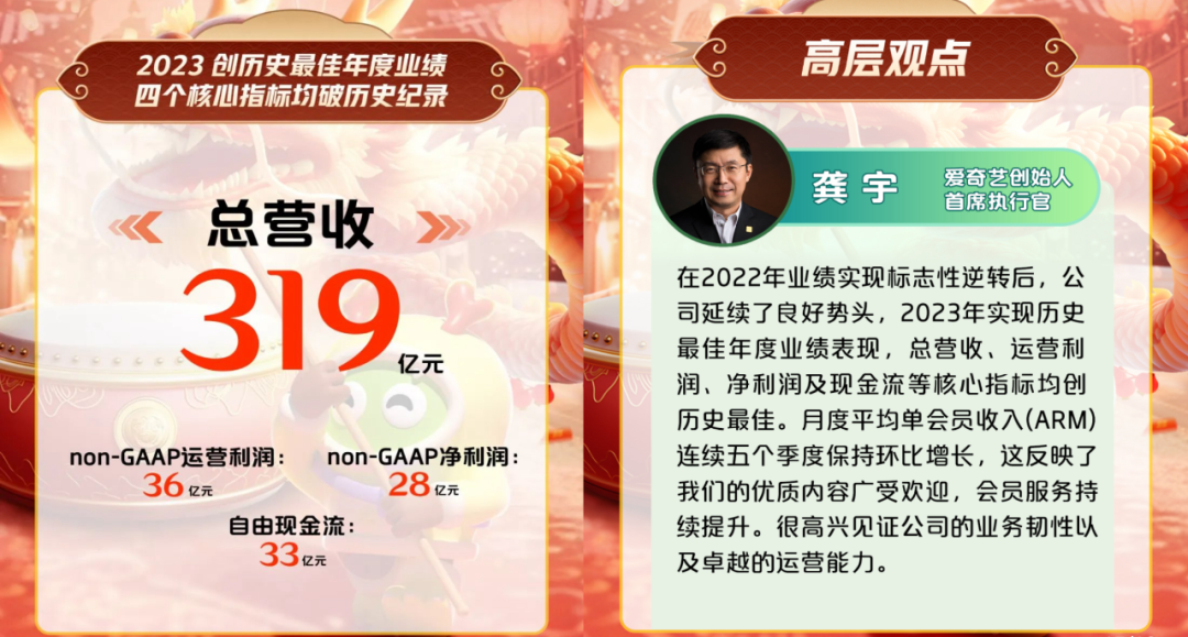爱奇艺用了“史上最佳年度业绩”的字眼来定义2023成绩单,四大核心指标的全年总营收319亿元、Non-GAAP全年运营利润36亿元、Non-GAAP净利润28亿元、自由现金流33亿元颇为亮眼,昭示了连续两年规模化运营盈利的新里程碑。