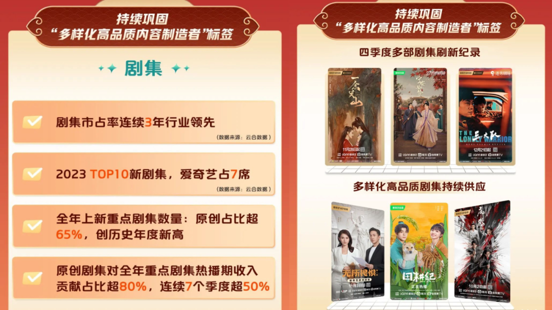 “降本”方面,各平台都学会了紧衣缩食,尤其是习得了精细控制单项目内容成本来挤出利润,比如此次爱奇艺年报就特别提到:“近3年剧集整体内容成本率逐年改善,2023年爱奇艺剧集的内容成本率较2022年下降了12个百分点,这直接推动了利润增长”。