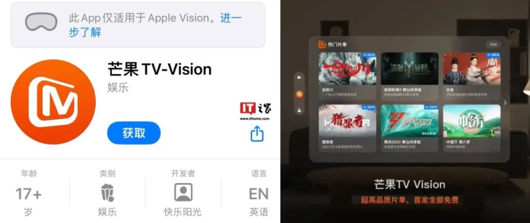 在犀牛君看来,讨论这个转机还需把时间维度拉长去看。其实在最近,犀牛君对芒果超媒爆出的另一则新闻颇感兴趣:湖南广播影视集团发文称,近日苹果AppStore正式上架了“芒果TV-Vision”APP,该APP也成为了首个苹果Vision Pro头显设备专属原生应用。