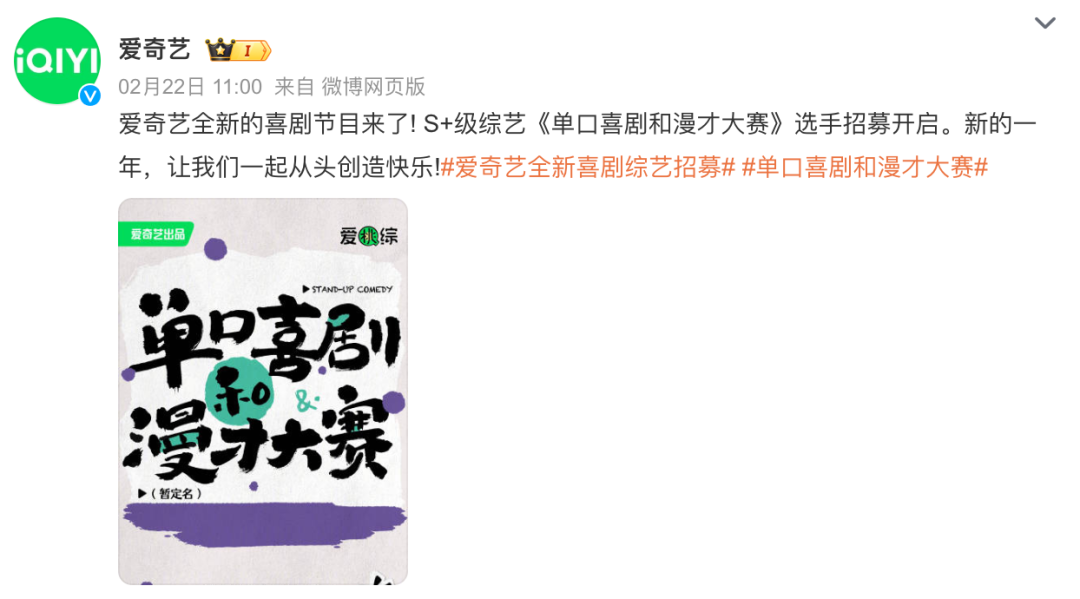 与《脱口秀和TA的朋友们》宣布选手招募先后动作的,是爱奇艺S+级综艺《单口喜剧和漫才大赛》选手招募开启,从节目名称和报名内容来看,爱奇艺的这档综艺更加聚焦,或许也能与《一年一度喜剧大赛》形成差异,以及喜剧形式的互补。