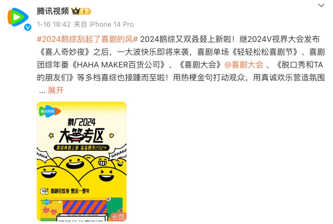 2024年刚过没多久,腾讯视频、爱奇艺喜剧节目的动作就已经先后开启。腾讯视频开年就宣布了2024年喜剧节目的企划,包括以“老熟人”为主的《轻轻松松喜剧节》、喜剧年番团综《HAHA MAKER百货公司》,以及《喜人奇妙夜》《喜剧大会》和《脱口秀和TA的朋友们》,其中《喜剧大会》在2023年已经开始录制,《喜人奇妙夜》在近期发布了视频宣传物料,这也是米未转身联手腾讯视频征战喜剧综艺的第一年,随后,另一档《脱口秀和TA的朋友们》则也于近期发布了线上招募信息。