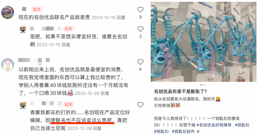这也就导致了不少用户在小红书等社交平台上吐槽着名创优品给他们带来的价格偏差,诸如“名创现在的产品定位好模糊,即使联名也不应该卖这么贵吧,真把自己当迪士尼呢”“自从名创跟各大动漫联名,我的天,它抢我钱!”等评价不在少数。