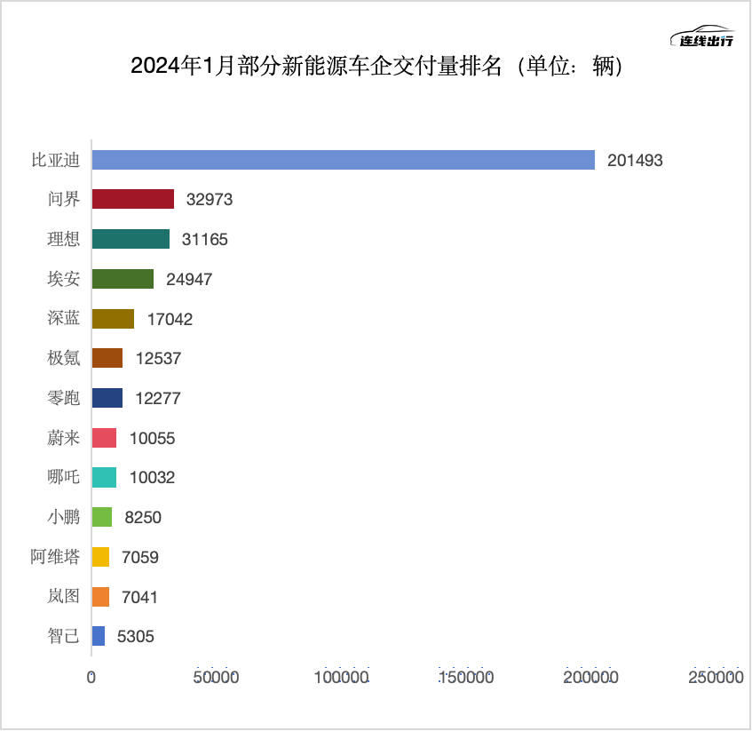 2024年1月部分新能源车企交付量排名,连线出行制图