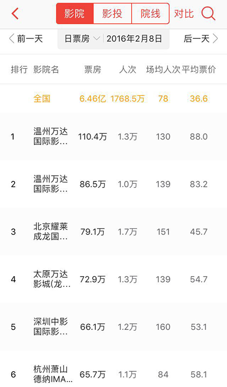 事实上,观众没有那么在意春节档影片的完成度,而是把观影看作回家娱乐消遣的方式。这已经体现在春节档的票仓上,去年春节二三线城市票房占据主导已经是不争的事实了。2016年大年初一,全国影院票房的冠亚军都来自温州,分别是当地两家万达影院,只有第三位才轮到了北京耀莱成龙国际影城,而前十中更包括了杭州、太原、长春、阜阳等非一线城市。据统计,北上广深四座一线城市2016年的春节票房仅占全国总票房的14%,甚至低于全年一线城市平均水平。况且这一数字,已经从2015年的25%逐步下滑到去年的18%。