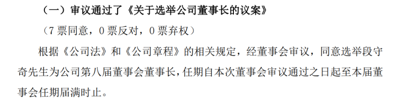 2023年6月,经董事会审议,全票通过选举段守奇为公司第八届董事会董事长。