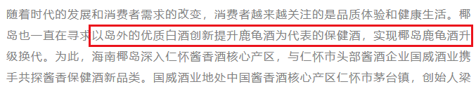 2023年12月19日,在海南椰岛的官方公众号上,公司借着建厂70周年庆典,也明确提出“椰岛也一直在寻求以岛外的优质白酒创新提升鹿龟酒为代表的保健酒,实现椰岛鹿龟酒升级换代。”