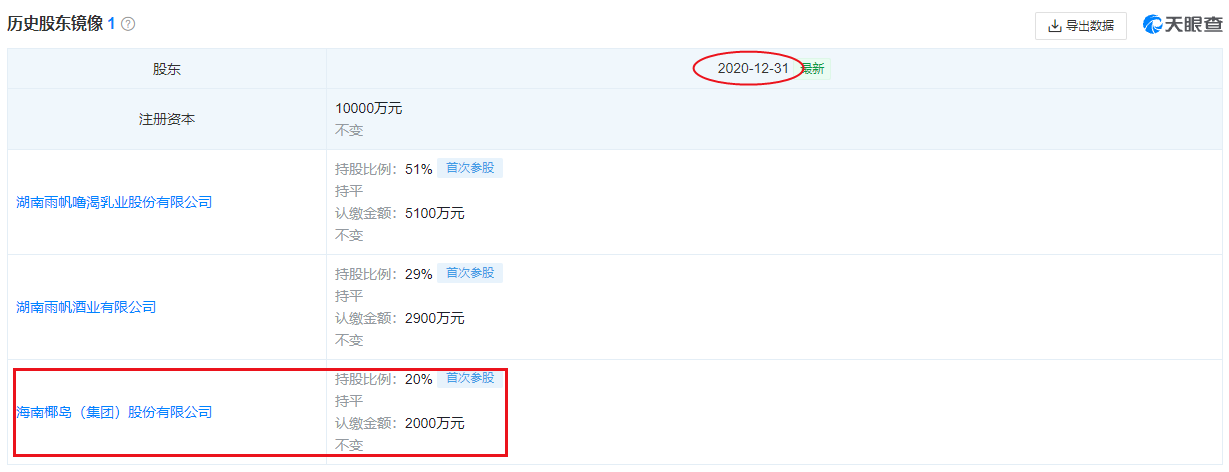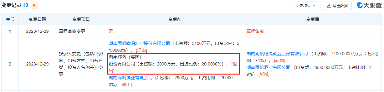 但天眼查显示,就在去年底,海南椰岛已退出椰岛雨帆的股东之列。