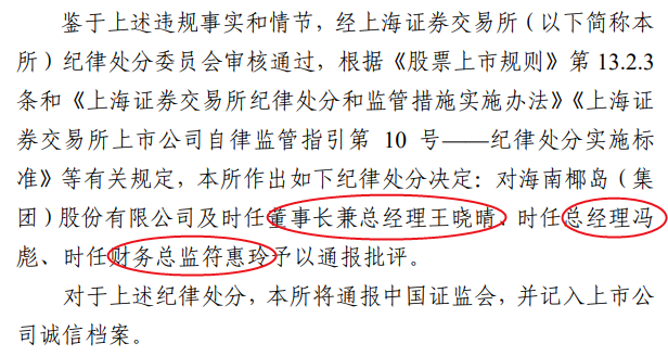 2023年9月15日,海南椰岛收到上海证券交易所的纪律处分决定书。原因在于公司多期定期报告披露的财务数据不准确。据此,上交所对海南椰岛时任董事长兼总经理王晓晴、时任总经理冯彪、时任财务总监符惠玲进行通报批评。