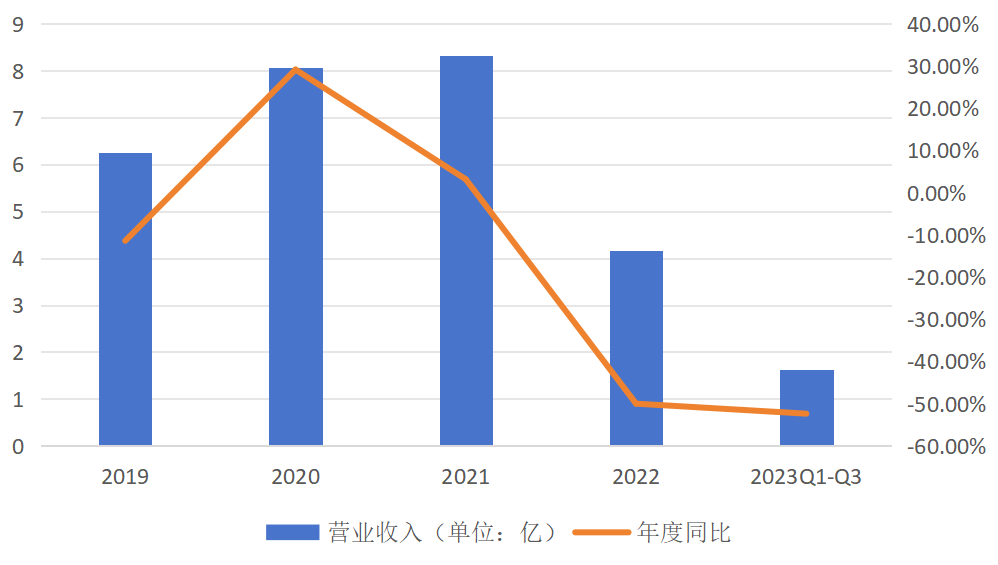 在此期间,海南椰岛的营收也遭遇重创。2021年,公司营收为8亿多元,到了2022年,这一数字急降至4亿多元。2023年前三季度,营收仅剩1.6亿元,同比下降52%。