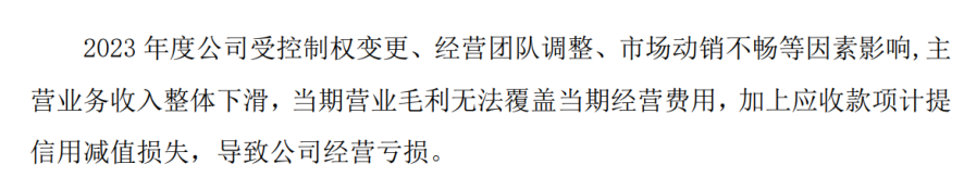 公告解释称,此次亏损的主要原因包括控制权变更、经营团队调整、市场销售不畅等多方面因素。这些因素导致公司主营收入整体下滑,毛利润无法覆盖经营成本,再加上计提信用减值损失,最终使得2023年净利润出现负数。