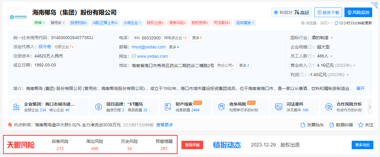 天眼查显示,海南椰岛的自身风险和周边风险都有几百条之多。