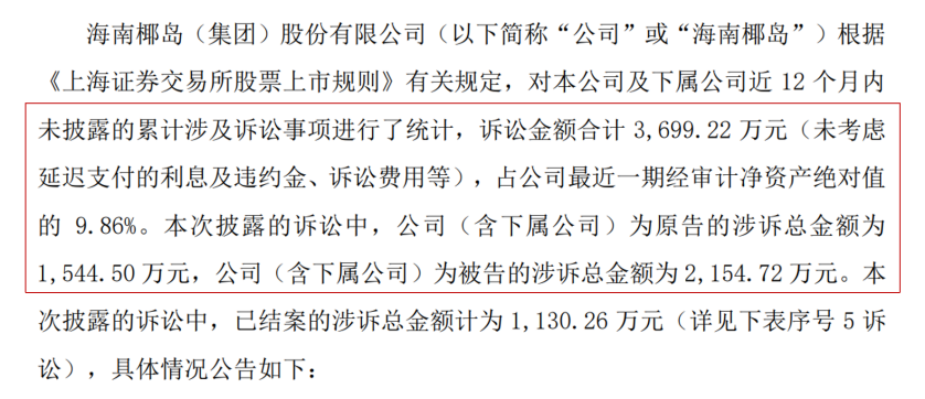 在内部管理问题等多重因素叠加下,海南椰岛过去一年诉讼不断。根据海南椰岛2024年2月6日发布的关于累计涉及诉讼的公告,公告发布日近12个月内,海南椰岛(含下属公司,下同)累计涉及诉讼20起。其中,未披露案件13起,已披露诉讼7起。