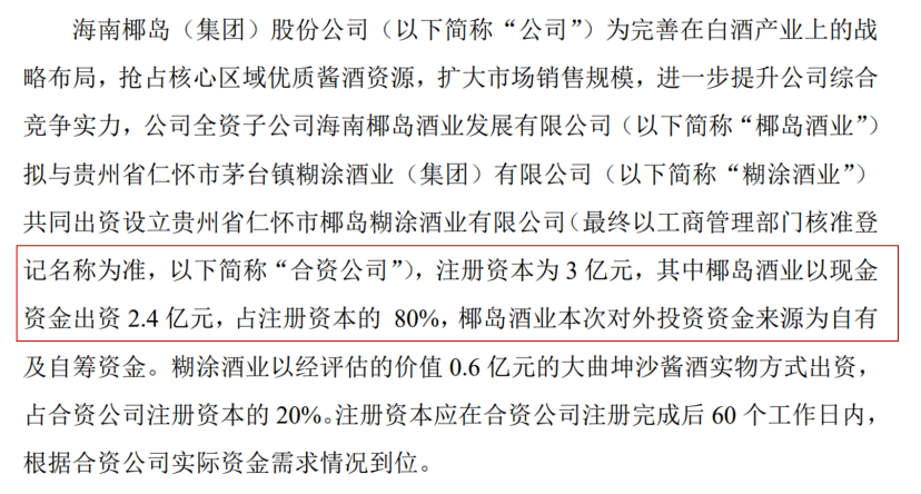 当年4月,海南椰岛的全资子公司海南椰岛酒业与糊涂酒业共同出资设立椰岛糊涂酒业。《对外投资公告》显示,海南椰岛酒业以现金出资2.4亿元,持有新公司80%的股份。