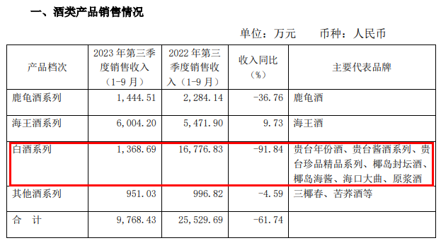 然而,随着酱酒市场逐渐回归理性,热潮退去,海南椰岛的酱酒事业并未如预期那样取得显著成果。根据2023年三季报数据,公司白酒系列收入下滑超过91%。