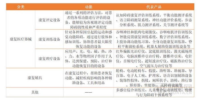 康复器械按照应用领域的不同,可分为康复医疗器械、康复教育设备和康复辅具等。其中康复医疗器械包括在康复医疗中用于康复评定、训练与治疗、有效改善或恢复患者功能的医疗设备,是康复器械的主要组成部分。