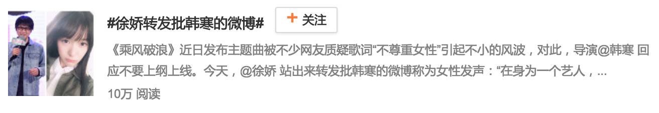 韩寒的破事连续炒了4天还没停歇,今天又上了一次热搜,不过和他上热搜的还有另外一个人:徐 娇