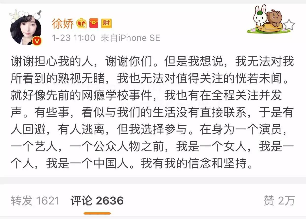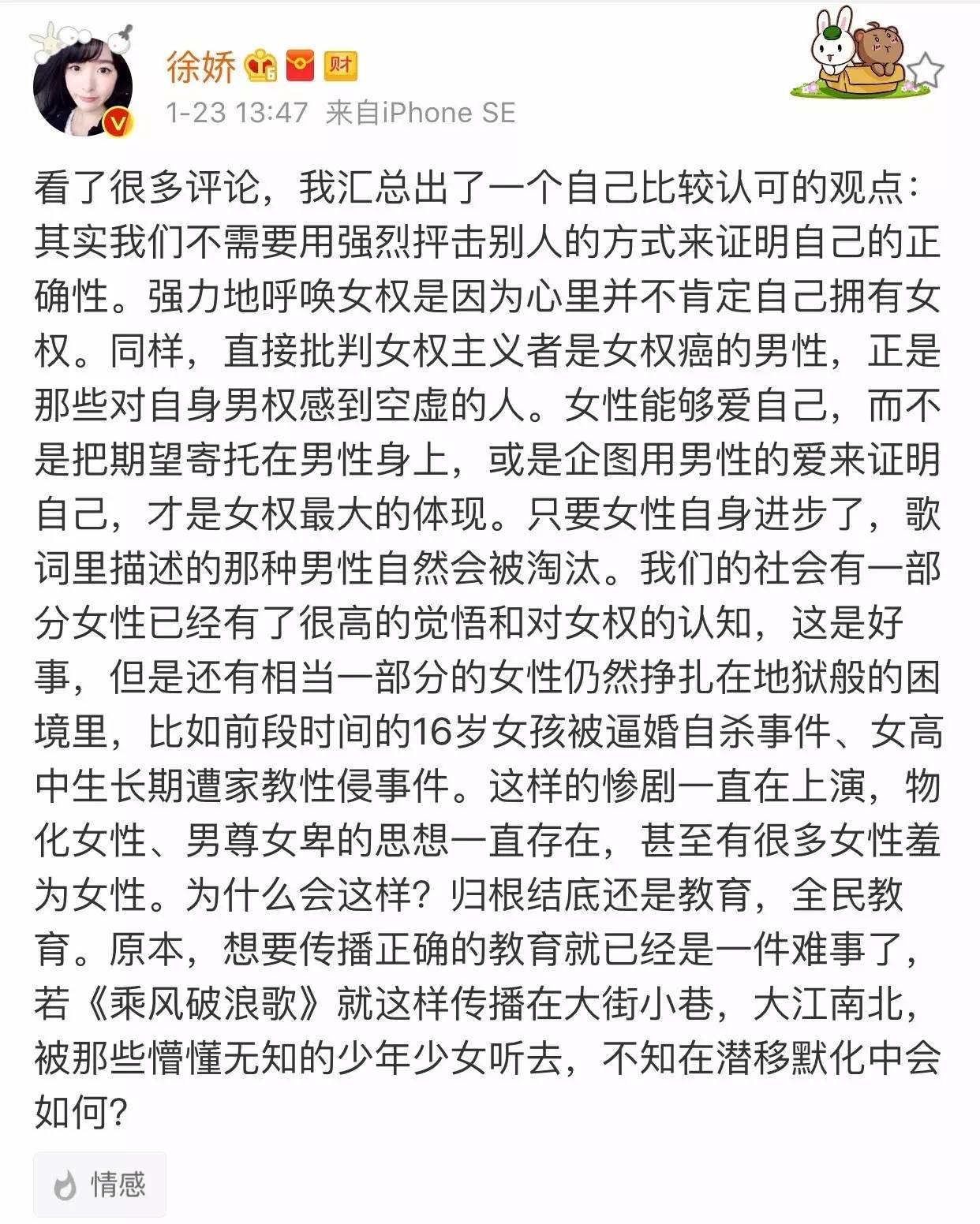 说真的,看到徐娇连发三条微博表明自己的态度,表达自己对于女权主义的支持,着实是让人感动,尤其是下面的这段话: