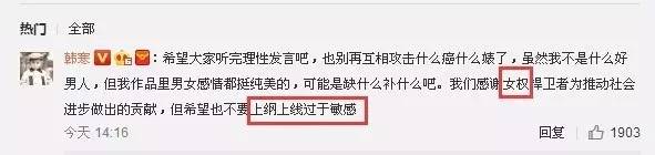 2017年才刚刚开始,韩寒就又拿着“女性”观众作筏子,不仅公然利用性别问题挑起公众情绪,甚至直指女性观众指责他是上纲上线。