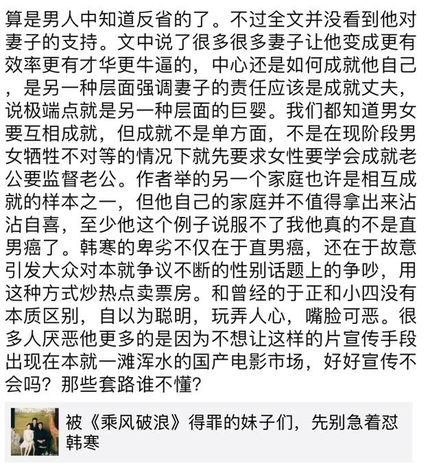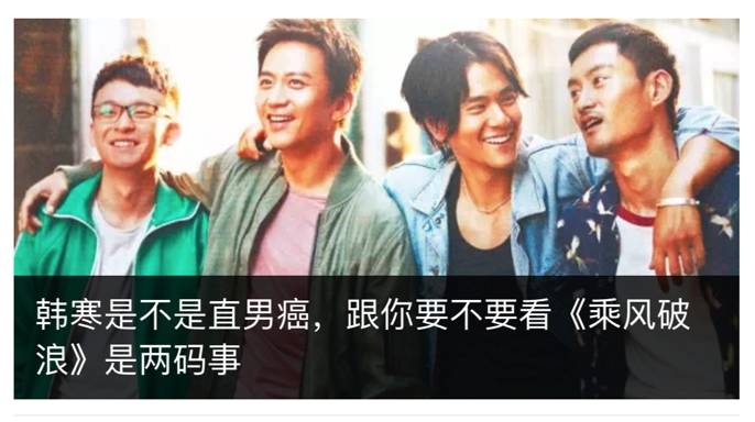 最后,韩寒是不是直男癌跟你要不要看《乘风破浪》更是两码事。想清楚这个问题,你对于所处的现在或许会更加坦然。