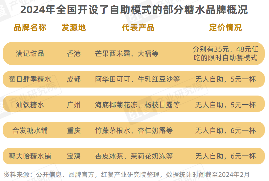 例如,满记甜品开放了糖水自助餐;在广州、深圳、上海、厦门、成都、重庆、杭州等多座城市则出现了无人自助糖水品牌,它们的定价多在5~6元一杯,模式新颖、定价实惠、支持外带场景等多重优势助力其“野蛮生长”。