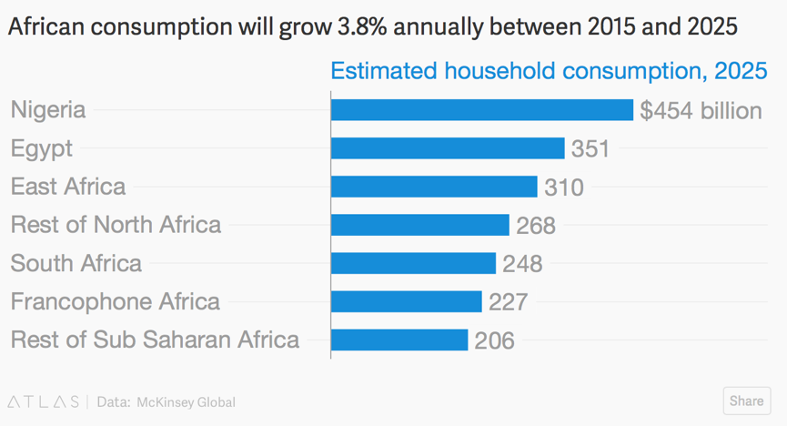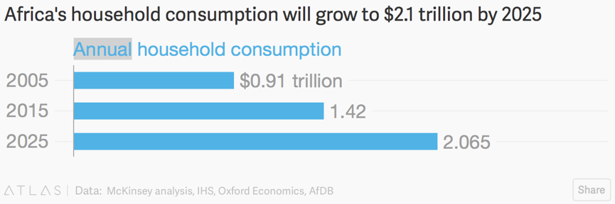 麦肯锡一份2016年9月的报告称,超市是一种地方性的商业。因为市场机会扩张,零售业是少数几样非洲公司的收入增速、利润率超过其全球同行的领域。从2015年到2025年,非洲的整体家庭消费将增长45%左右,现在进入非洲的超市行业时机正好。