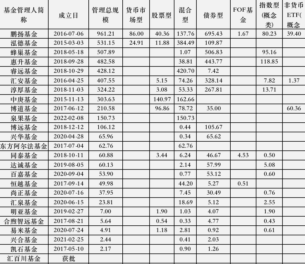 截止最新,个人系公募总管理规模约4850亿元,占全市场规模不到2%。24家公司发展分化,Wind数据显示,截至2023年四季度,有11家个人系公募管理规模超100亿元。公募管理规模第一的鹏扬基金,规模近千亿元。泓德基金、蜂巢基金、惠升基金、睿远基金在500亿元上下。泉果基金达到了150亿元的体量。