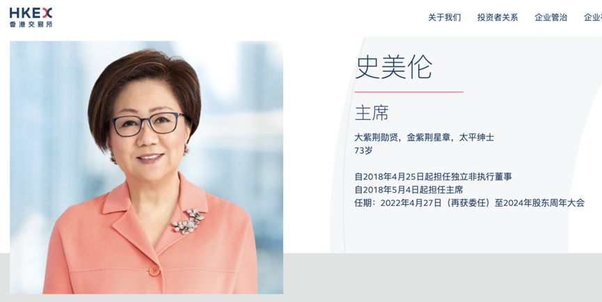 备受关注的是,港交所主席史美伦将于今年4月集团股东周年大会结束后退任。现年73岁,史美伦出生于上海,成长于香港,是港交所一位关键女性。