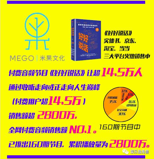 《饭局的诱惑》推出的“直播+点播”模式,在网综界是“第一个吃螃蟹的人”。做《拜拜啦肉肉》,则是米未团队“不甘心做了那么多年棚内综艺”,首次对户外真人秀节目的挑战。而米未旗下品牌“米果文化”推出的付费音频课程《好好说话》,则是音频知识付费领域的先行产品,2016年6月在喜马拉雅FM上线后,截至2016年底,销售额超过2800万,位列全网付费音频销售额第一。