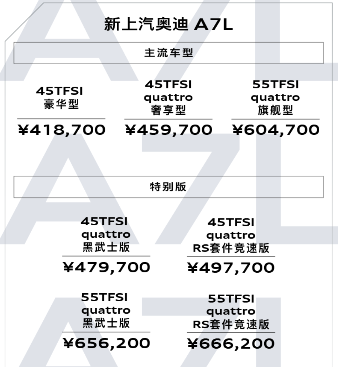 3月1日,上汽奥迪官微宣布,新上汽奥迪A7L正式上市,共推出7款车型,售价区间为41.87万-66.62万元。