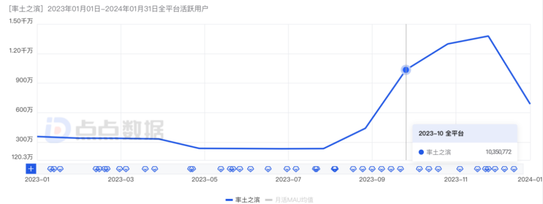 点点数据显示,从去年8月份起,《率土之滨》MAU数据在不断攀升,并且23年12月迎来顶点,其MAU数据环比1月份增长了2.8倍。