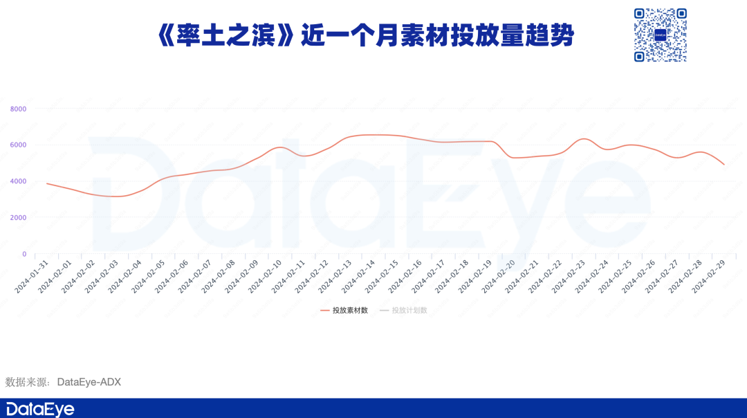 ADX数据显示,春节期间,《率土之滨》日均素材投放量从1月底的3500组素材,上升至日均6000组素材,涨幅约为70%。