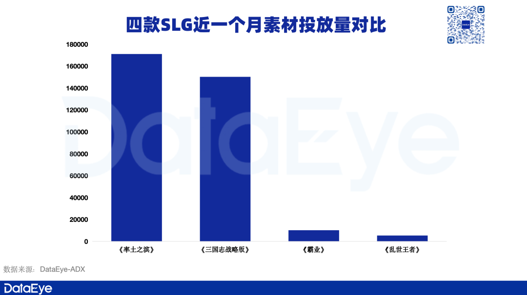 ADX数据显示,四款三国/国风题材SLG中,《率土》素材投放力度较大。上线期买量凶猛的《霸业》反而力度中等。不擅买量的腾讯两款产品则表现平平。