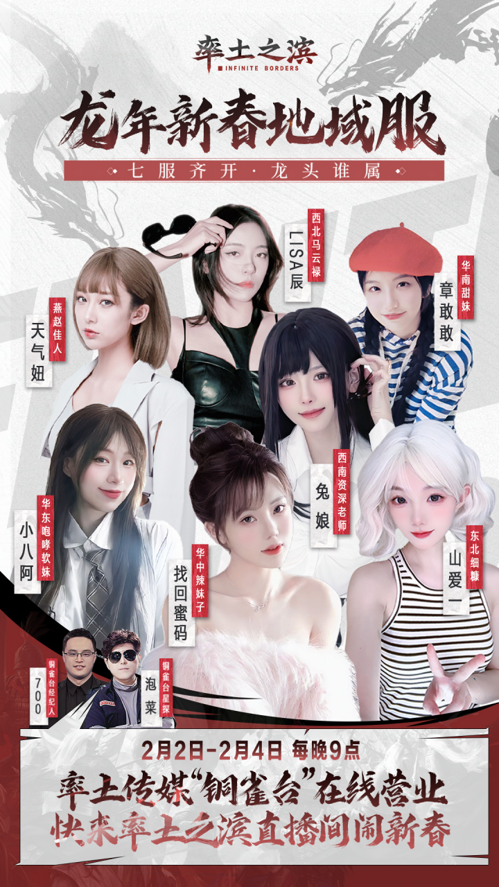 2月8日-2月11日,《率土之滨》启动“地域服”内容,玩家可以在7个地域服中选择一个加入,并且官方还配备了包括七百、龙皇、红旗在内的7名率土知名主播以及嗨氏、少帮主、JY、Zhan-等5名明星主播群。