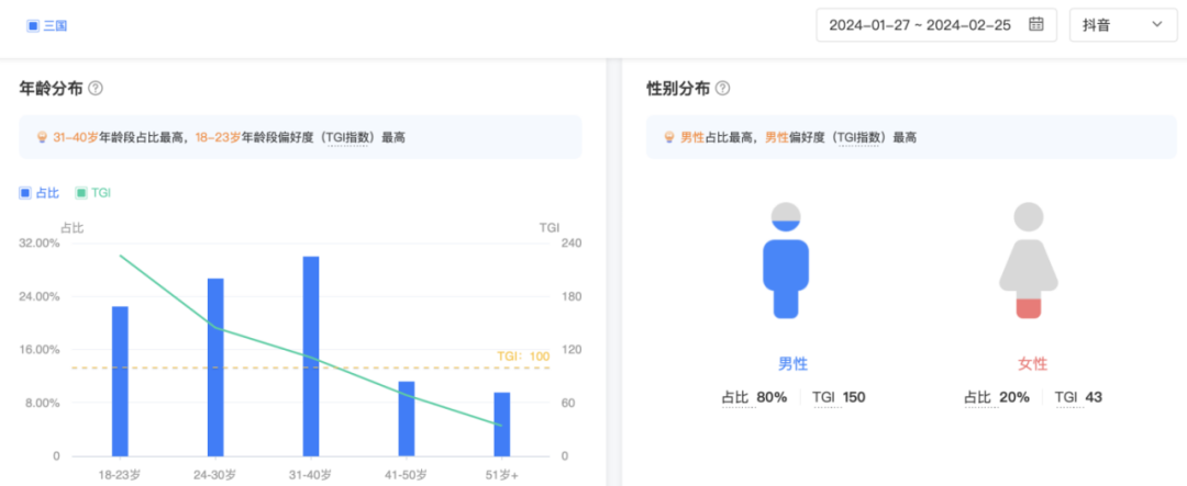 巨量算数显示,近一个月时间中,抖音平台搜索“三国”的用户中,18-30岁区间的用户占比约为45%。这表明,三国的受众群体正在往年轻化偏移。(传统三国题材为何走向年轻化?文末详聊)