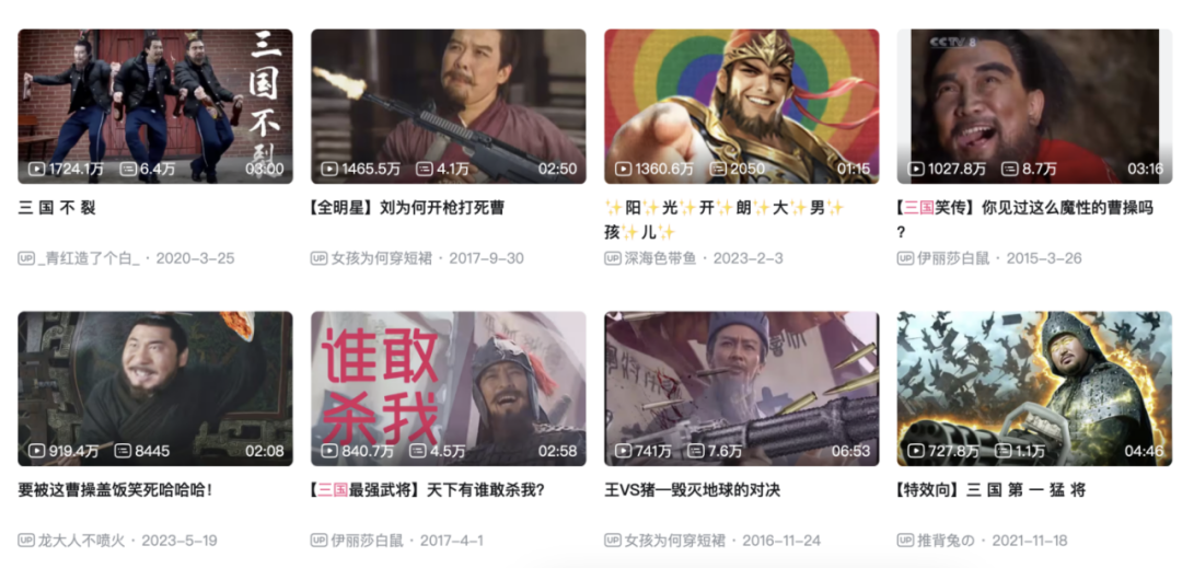 阶段一,是早几年魔性鬼畜搞笑阶段。在B站平台,不乏千万播放量级别的“三国鬼畜”视频。其原因或许是此类视频贴合当代年轻群体热衷新热点、新潮流、新风向的趋势,把历史上严肃、伟岸的三国人物,加一段素材整活成魔性视频,已经成为当下年轻用户的“电子榨菜”。