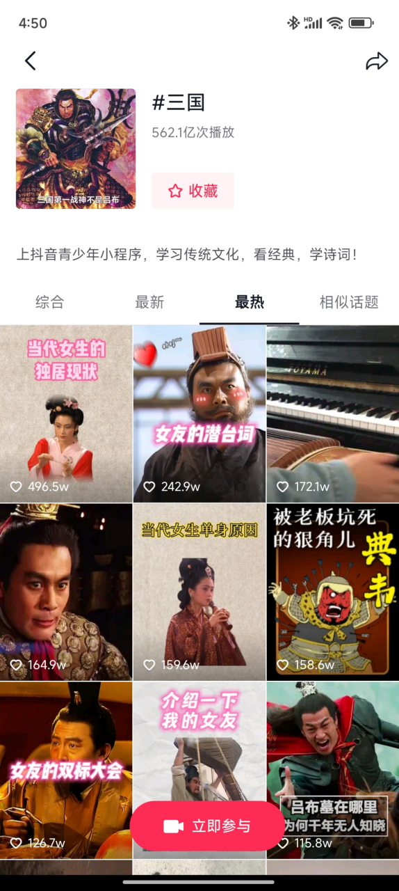阶段二,是近两年“年轻人现状类”内容爆火。抖音上“当代年轻人XX现状”、“当代男生/女生单身原因”之类的视频,引用了大量三国元素。如在抖音平台,#三国 话题,高达560亿次播放,最热视频就是这类“年轻人现状类”内容。这些内容的出圈,为年轻群体带去一种感知:三国,宝藏、有趣、不止鬼畜、更有共鸣。