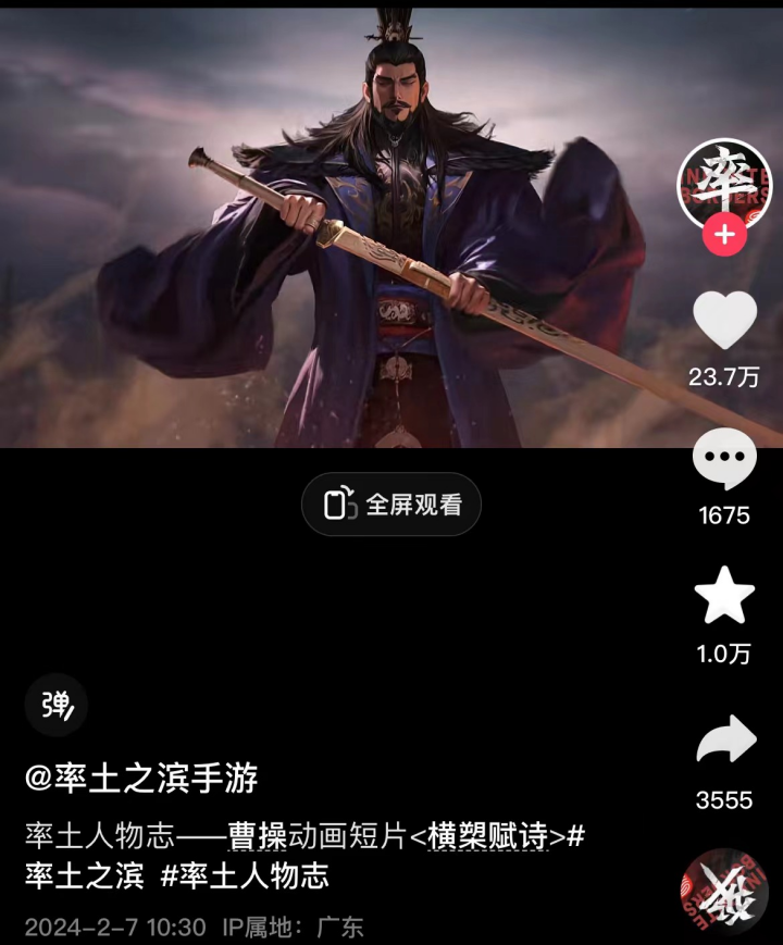 春节前夕,《率土之滨》发布新一期,“率土人物志”——曹操动画短片,在抖音平台,该短片取得了超23万次的点赞量。