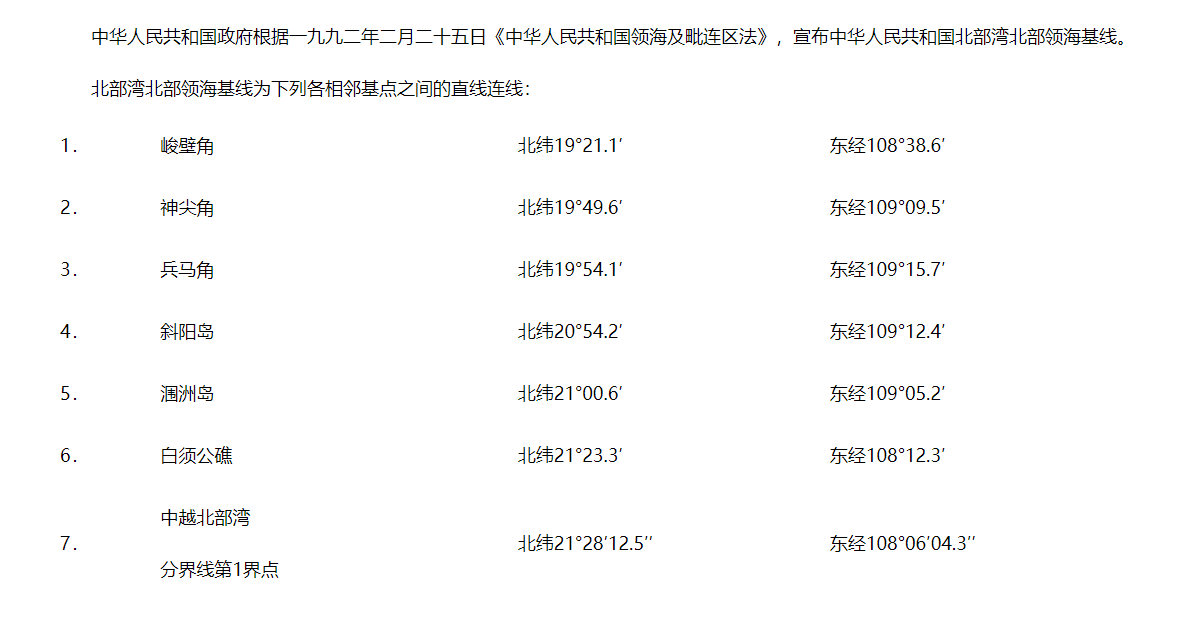 据外交部网站,中华人民共和国政府根据一九九二年二月二十五日《中华人民共和国领海及毗连区法》,宣布中华人民共和国北部湾北部领海基线。