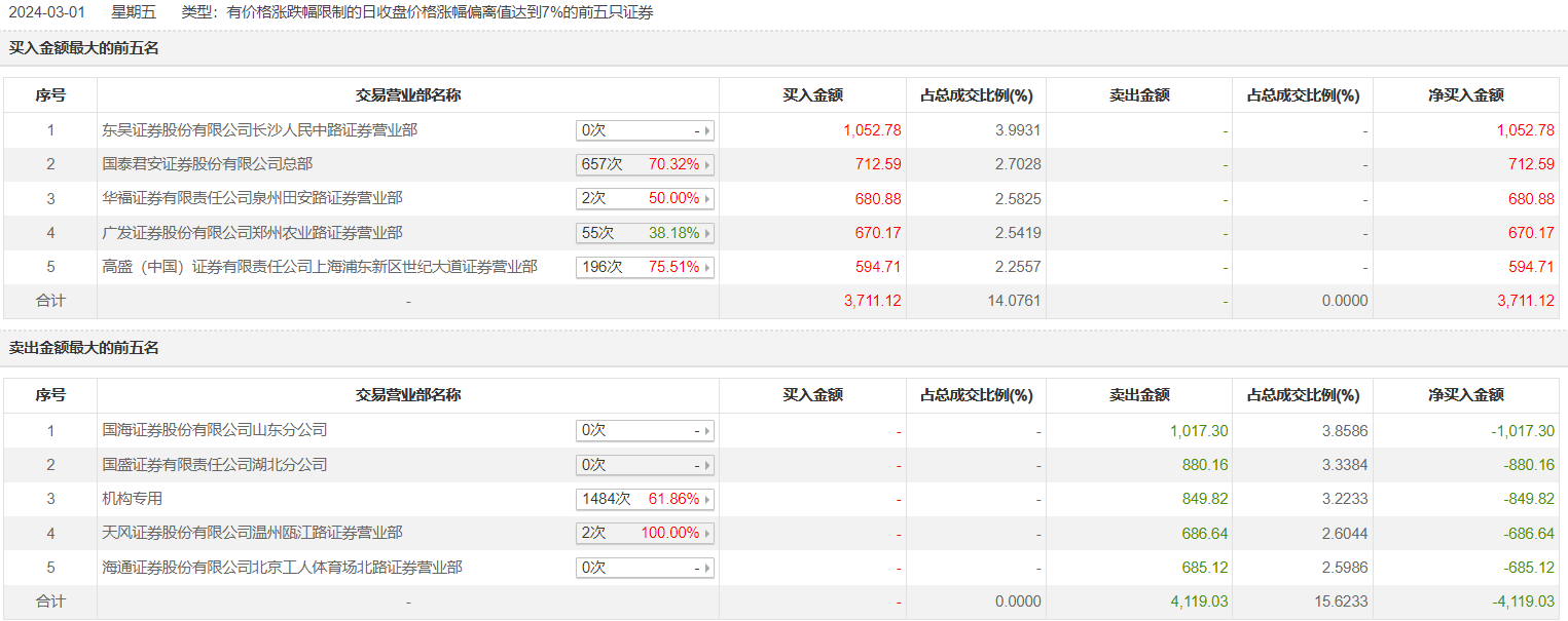 具体来看,机构合计净卖出849.82万元。此外,东吴证券长沙人民中路证券营业部、国泰君安证券总部分别买入1052.78万元、712.59万元;国海证券山东分公司、国盛证券湖北分公司分别卖出1017.30万元、880.16万元。