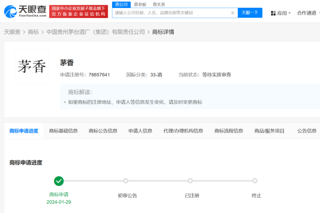 天眼查知识产权信息显示,近日,中国贵州茅台酒厂(集团)有限责任公司申请注册一枚“茅香”商标,国际分类为酒,当前商标状态为等待实质审查。