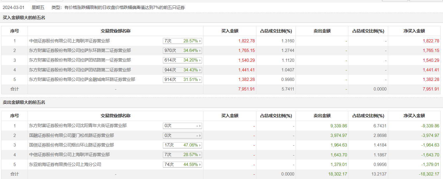 具体来看,东方财富证券沈阳青年大街证券营业部、国融证券厦门松岳路证券营业部分别卖出9339.86万元、3974.97万元;中信证券上海联洋证券营业部、东方财富证券拉萨东环路第二证券营业部分别买入1822.78万元、1765.15万元。