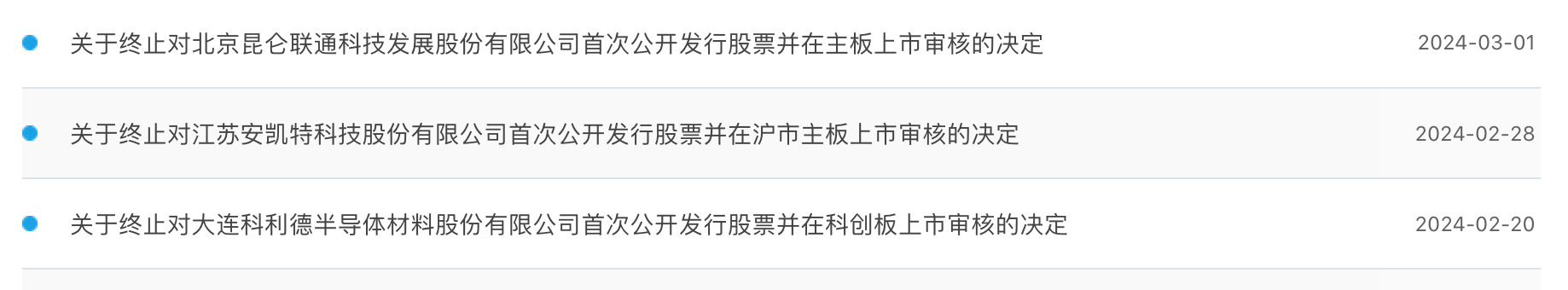 据上交所,自春节前认养一头牛撤回IPO申请之后,春节后的2月20日披露,大连科利德半导体材料股份有限公司的保荐人海通证券申请撤销保荐工作;2月28日披露,因公司和保荐人双双撤回,江苏安凯特科技股份有限公司推出IPO的工作;3月1日披露,北京昆仑联通科技发展股份有限公司也加入了撤回IPO的行列。